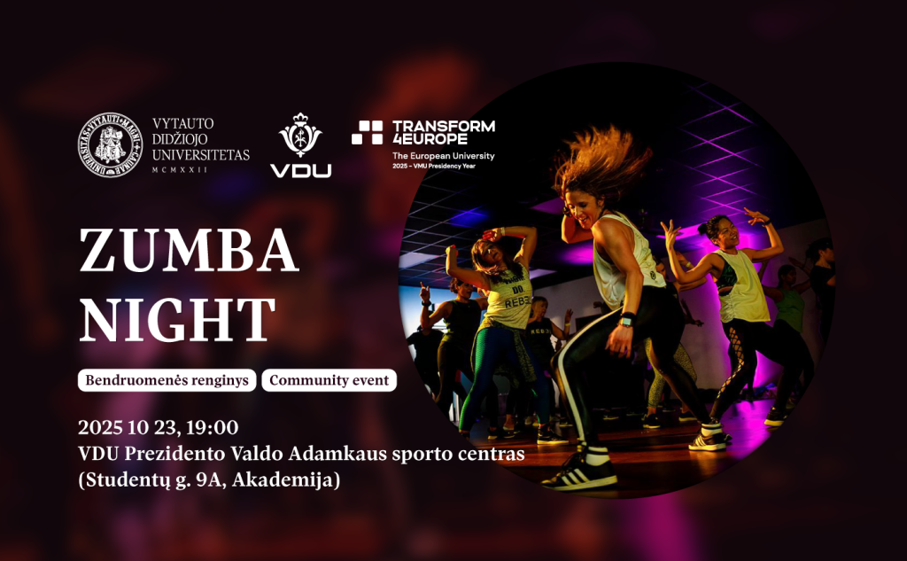 Vytauto Didžiojo universiteto bendruomenė kviečiama į rudens sezono renginį „ZUMBA NIGHT“, kuris spalio 23 d. (ketvirtadienį) vyks VDU Prezidento Valdo Adamkaus sporto centre (Studentų g. 9A, Akademija).
